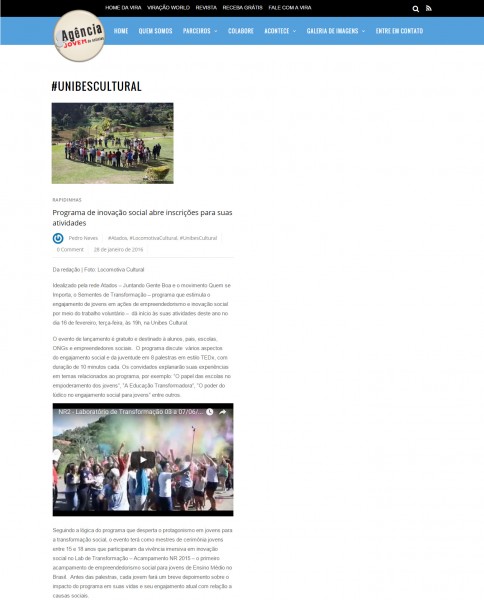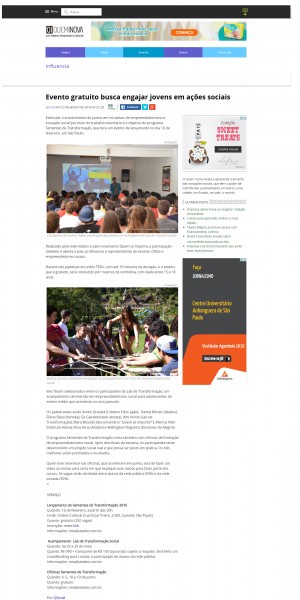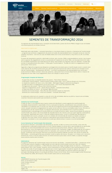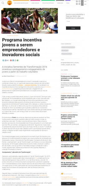 O programa de empreendedorismo e inovação social inspira jovens de todo Brasil a serem agentes de transformação da sociedade, desenvolvendo a capacidade crítica e resolução de desafios, entendimento mais profundo sobre a realidade e os problemas que os cercam, por meio de um programa que ensina metodologias de inovação social, atuação voluntária e engajamento em ações sociais práticas. Entre as atividades estão o 1º Acampamento de empreendedorismo social para jovens do Brasil, Cursos e Oficinas.